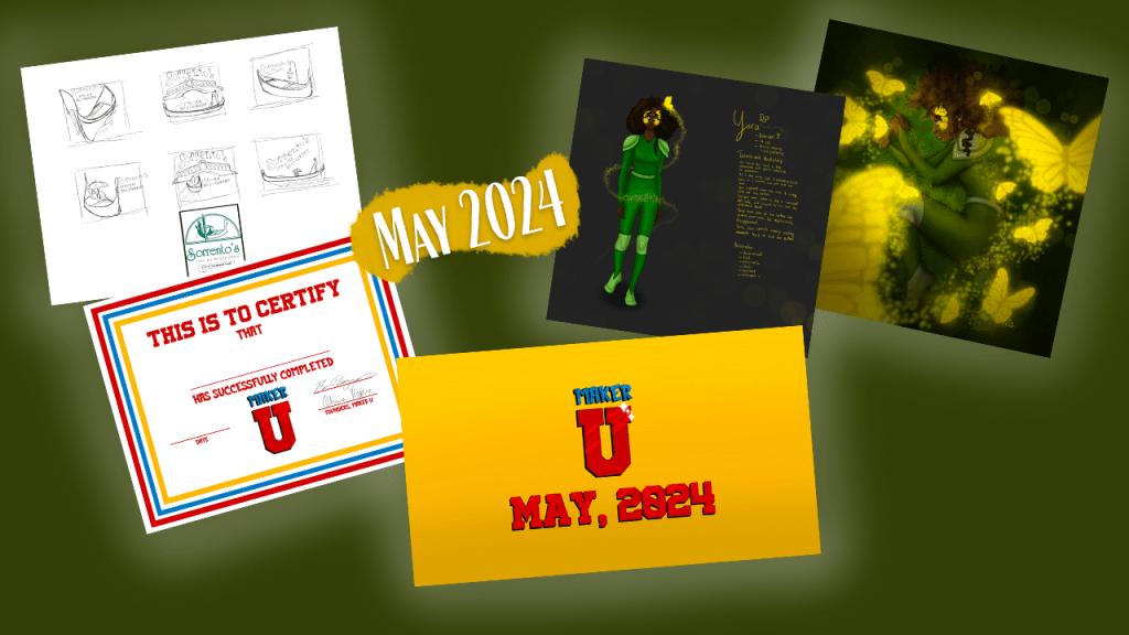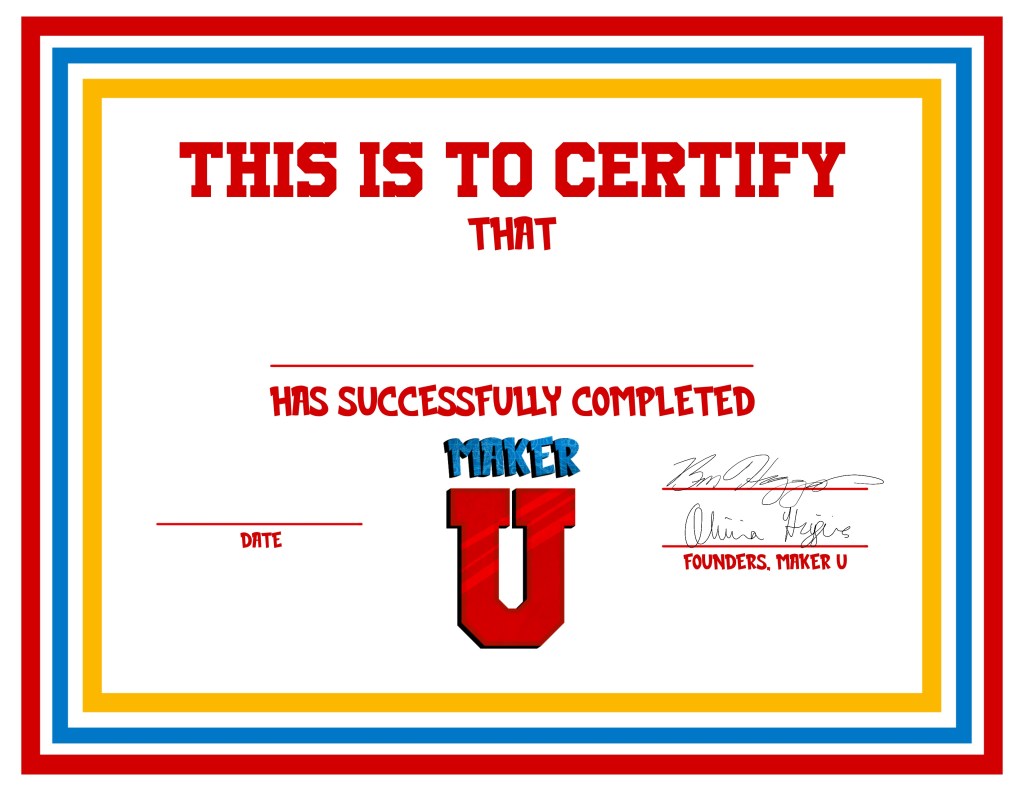 I designed a certificate to hand out to kids once they completed Maker U, and a title card thing (I’m not quite sure what to call it) for a slide show I did of the event!